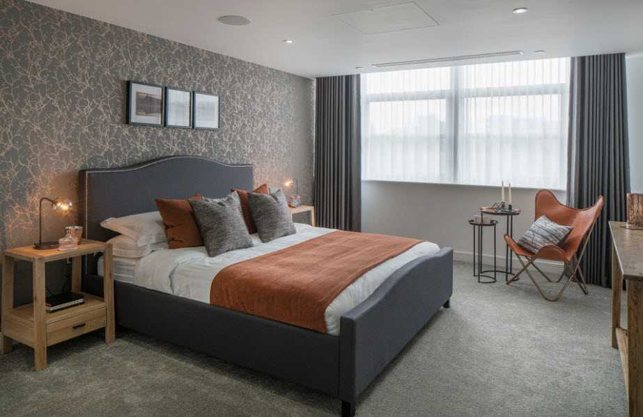 Говоря об интерьере спальни в темных тонах, стоит уделить внимание не только мебели, но и другим элементам интерьера полам, мебель, аксессуарам и текстилю