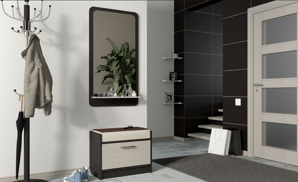 Зеркало – это незаменимый предмет в каждой прихожей не зависимо от ее размеров. Зеркало расширяет визуально помещение, освещает и служит комфортным инструментом для того, чтобы вы смогли привести себя в порядок перед выходом. Оно может иметь любую форму. Но не стоит покупать огромное зеркало, если у вас маленькая площадь прихожей. Сегодняшний рынок предлагает несколько моделей такого комода: монолитный короб с прикрепленным зеркалом и модели без скреплённых между собой элементов, то есть зеркало будет висеть отдельно на стене.