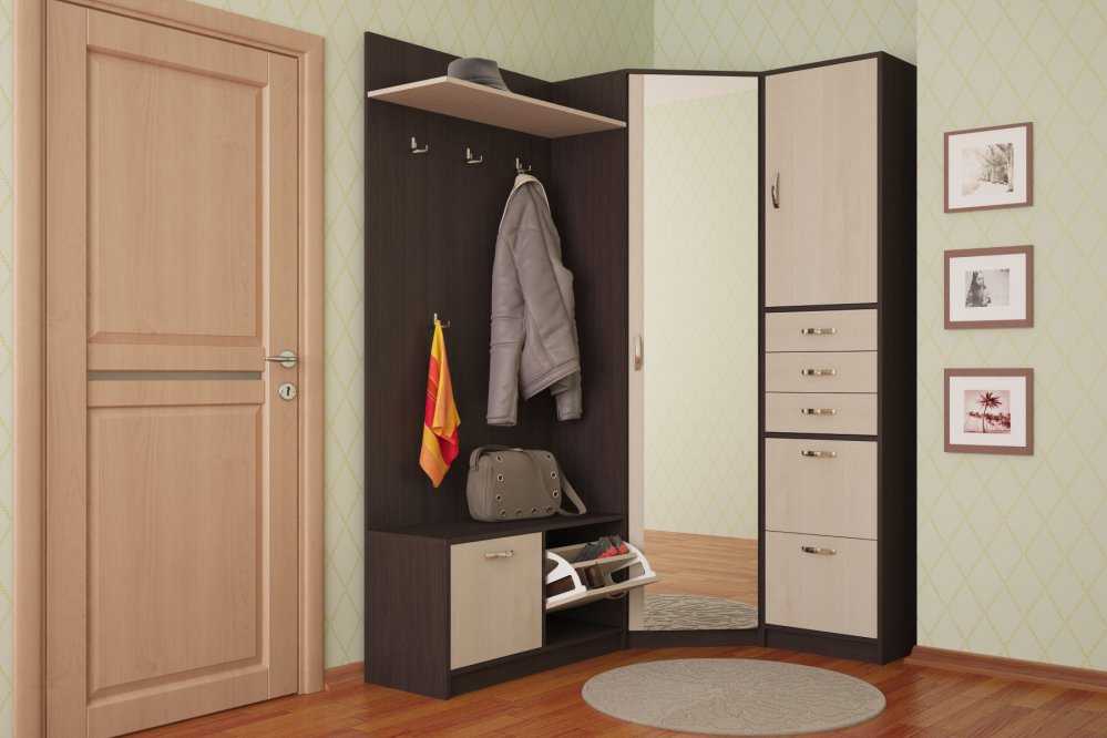 - для маленькой прихожей в хрущевке подойдет угловой шкаф, располагающийся напротив входной двери. Он вмещает и место для хранения, и крючки для верхней одежды ежедневного пользования. Такой комплект удобен при наличии в нем мягкого пуфика;