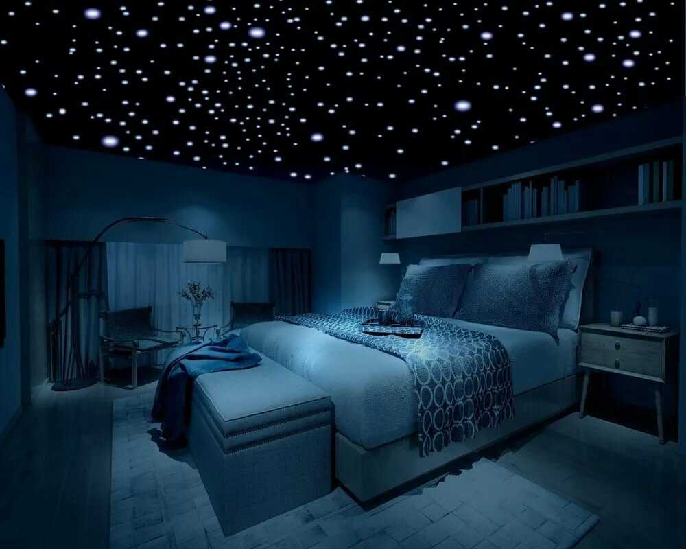 - для спальной зоны подойдут темные потолки в виде звездного неба;