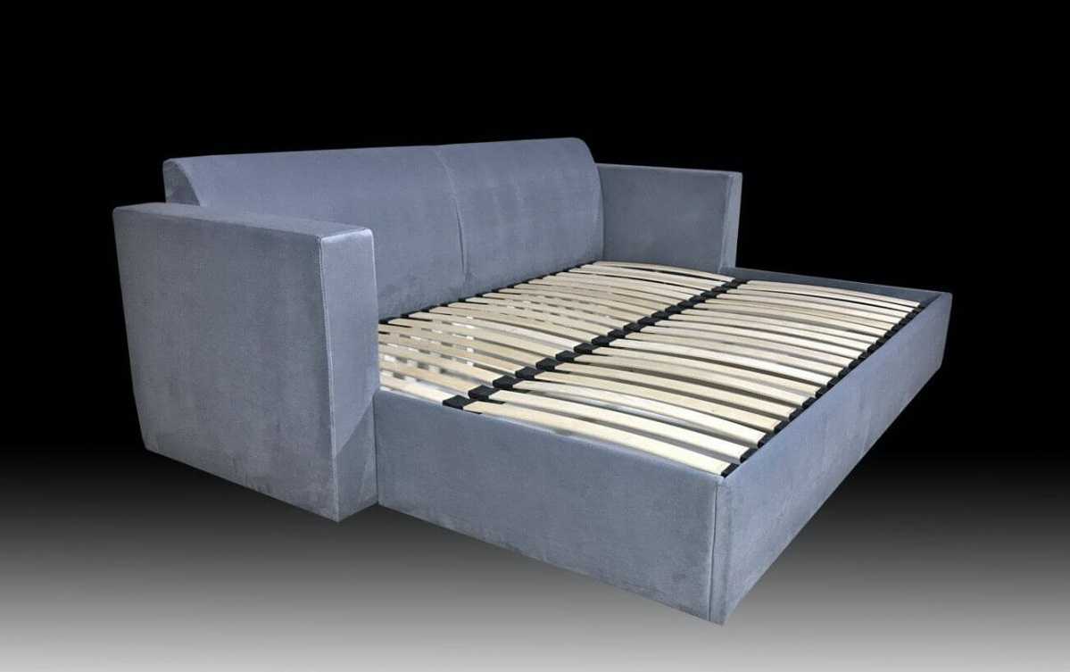 Диван с металлическими рамами при необходимости можно разобрать, что повышает его удобство при переезде. Ламели изготавливают из высушенной древесины или ПВХ.