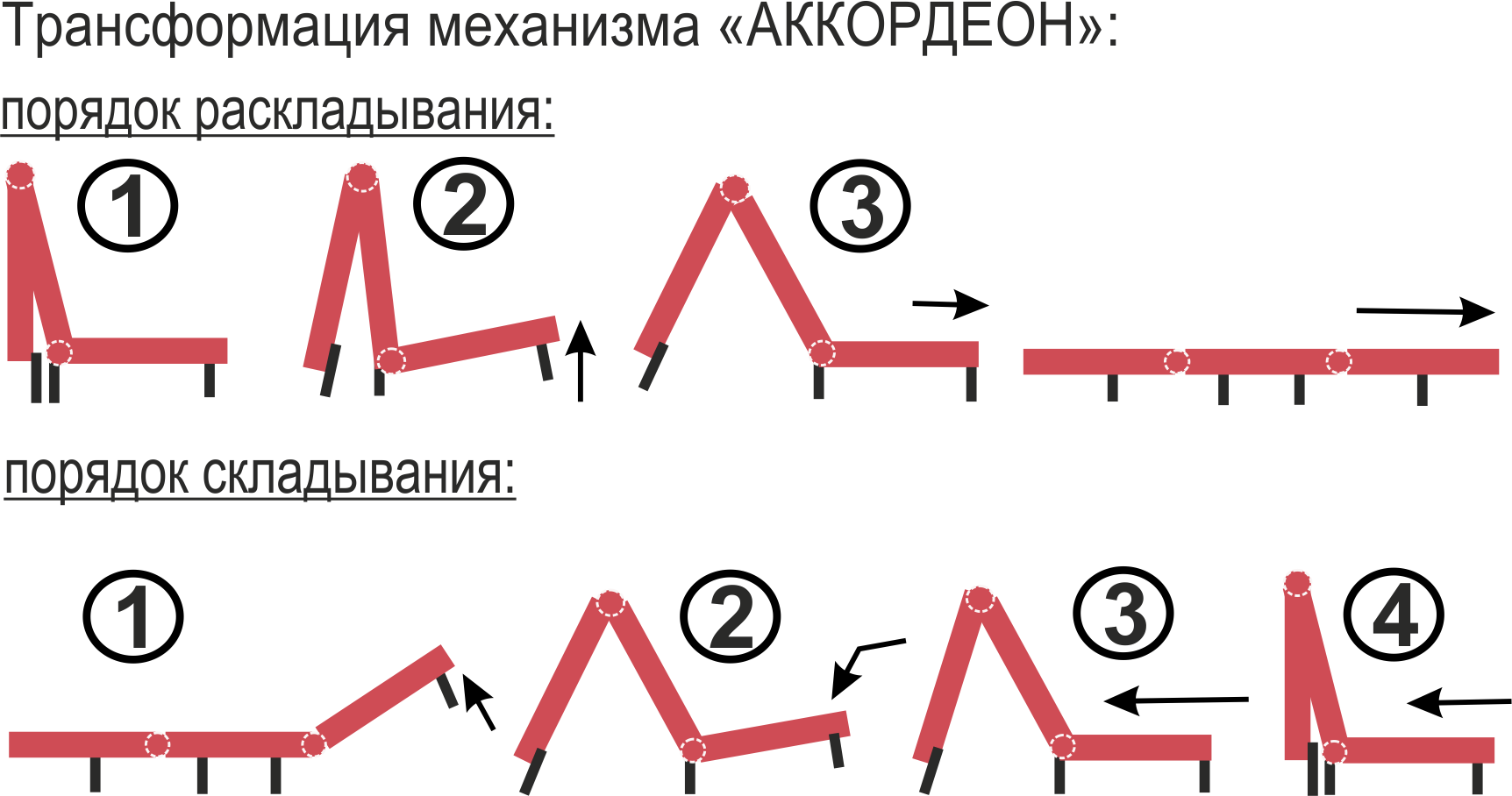 Превратить собранный диван в полноценную кровать достаточно просто, ведь именно для этого и предназначен механизм. Последовательность раскладки аккордеона следующая: