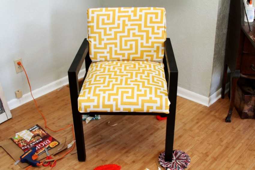 Когда конструкция собрана, завершающим этапом будет ее комфортно-декоративная составляющие. Самое время сшить подушки для сидения и спинки. Чтобы на такой мебели было удобно сидеть на протяжении долгого времени, проложите между сидением и обивочной тканью мягкий поролон.