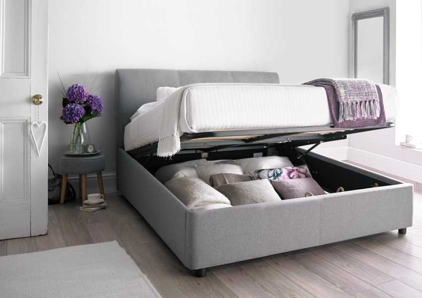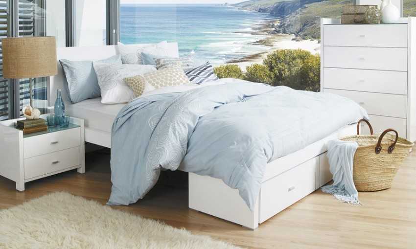 Чаще всего под основанием кровати ничего нет, такой вариант удобен при проведении влажной уборки. Но для экономии места подойдет каркас с ящиками, где можно хранить постельные принадлежности.