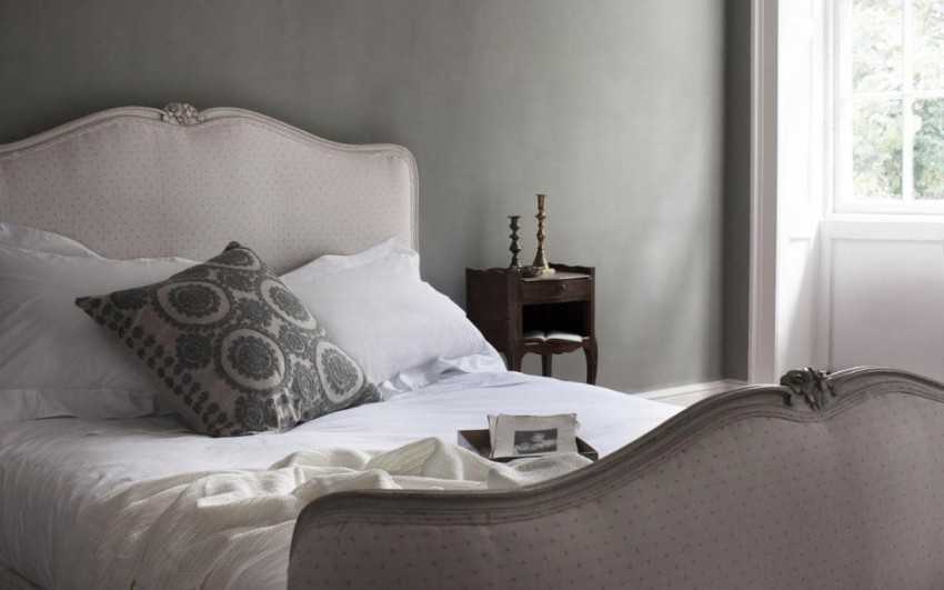 На фото двуспальная кровать с изголовьем, декорированным мягкой текстильной обивкой серого цвета.