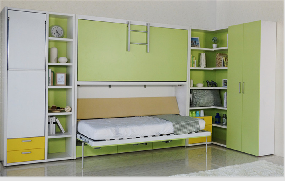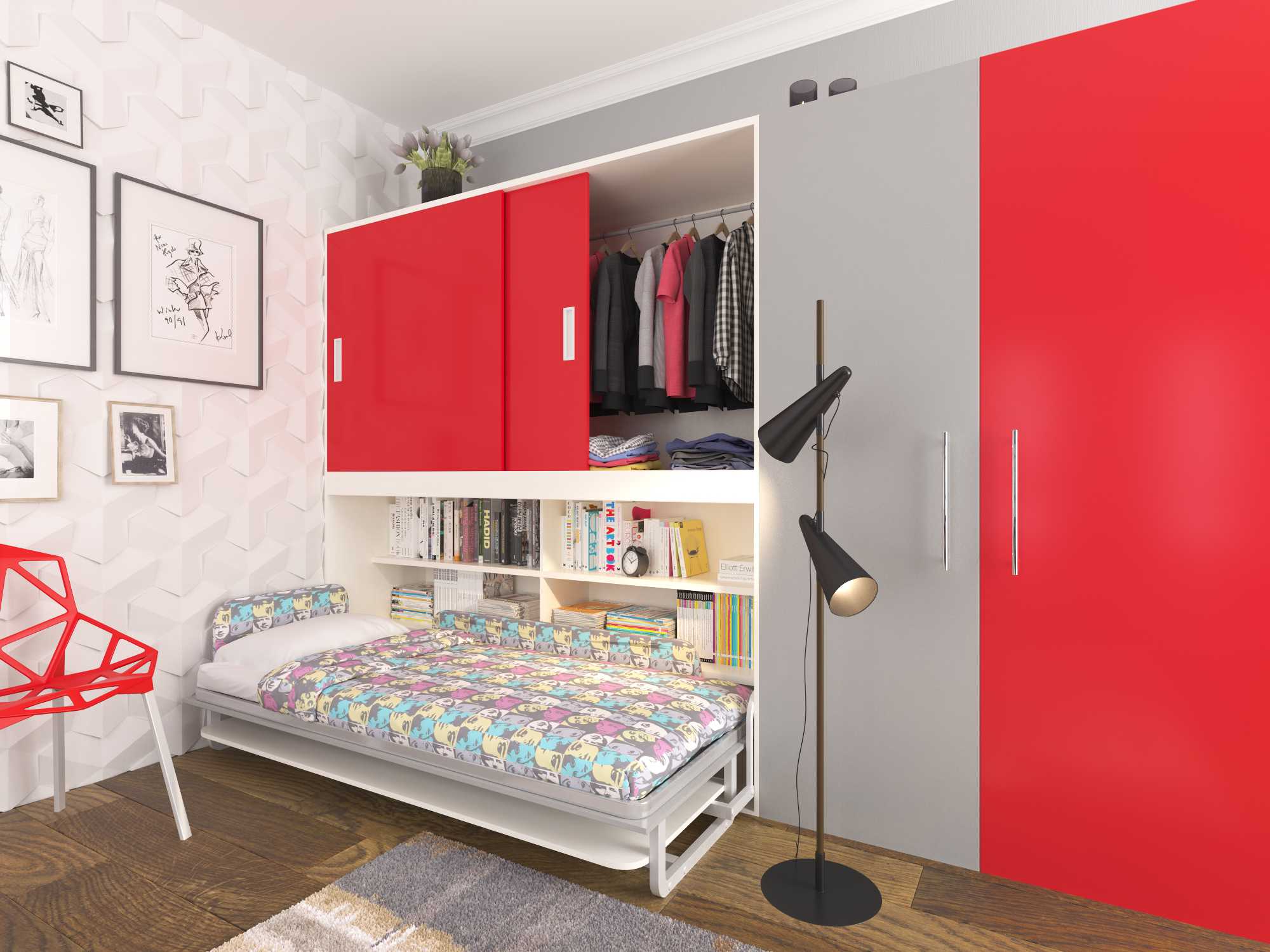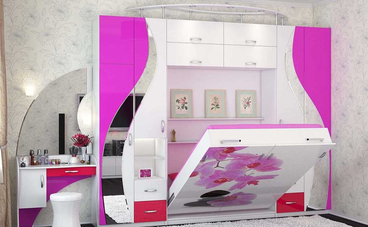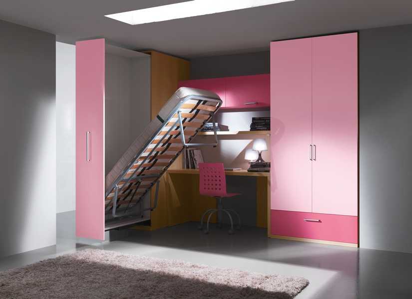 Один из лучших вариантов — вертикальная кровать, совмещенная со шкафом для одежды. Если в семье один ребенок, можно выбрать модель, сочетающую в себе функцию спального места и стола. Такой вариант помогает решить проблему приготовления домашних заданий без покупки специальной школьной мебели. С оборотной стороны ложа крепится столешница с ярким рисунком, который сам по себе может стать оригинальным декором интерьера.