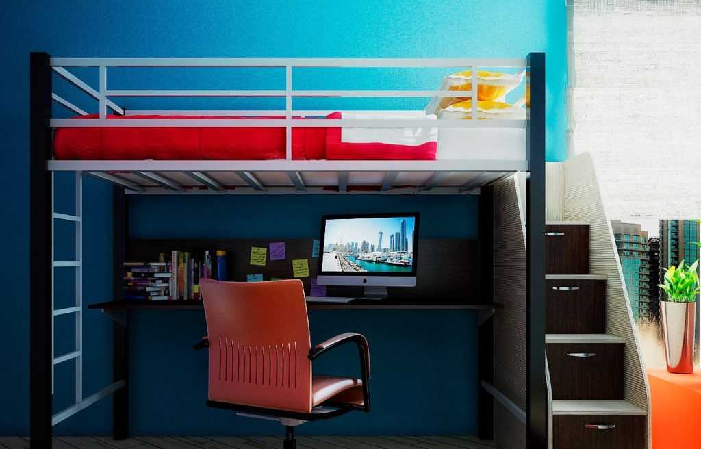Основное преимущество – компактность. Например, двуспальная кровать чердак с передвижным рабочим местом займет намного меньшую площадь, чем оснащенные более традиционной мебелью места для сна и работы с документами.