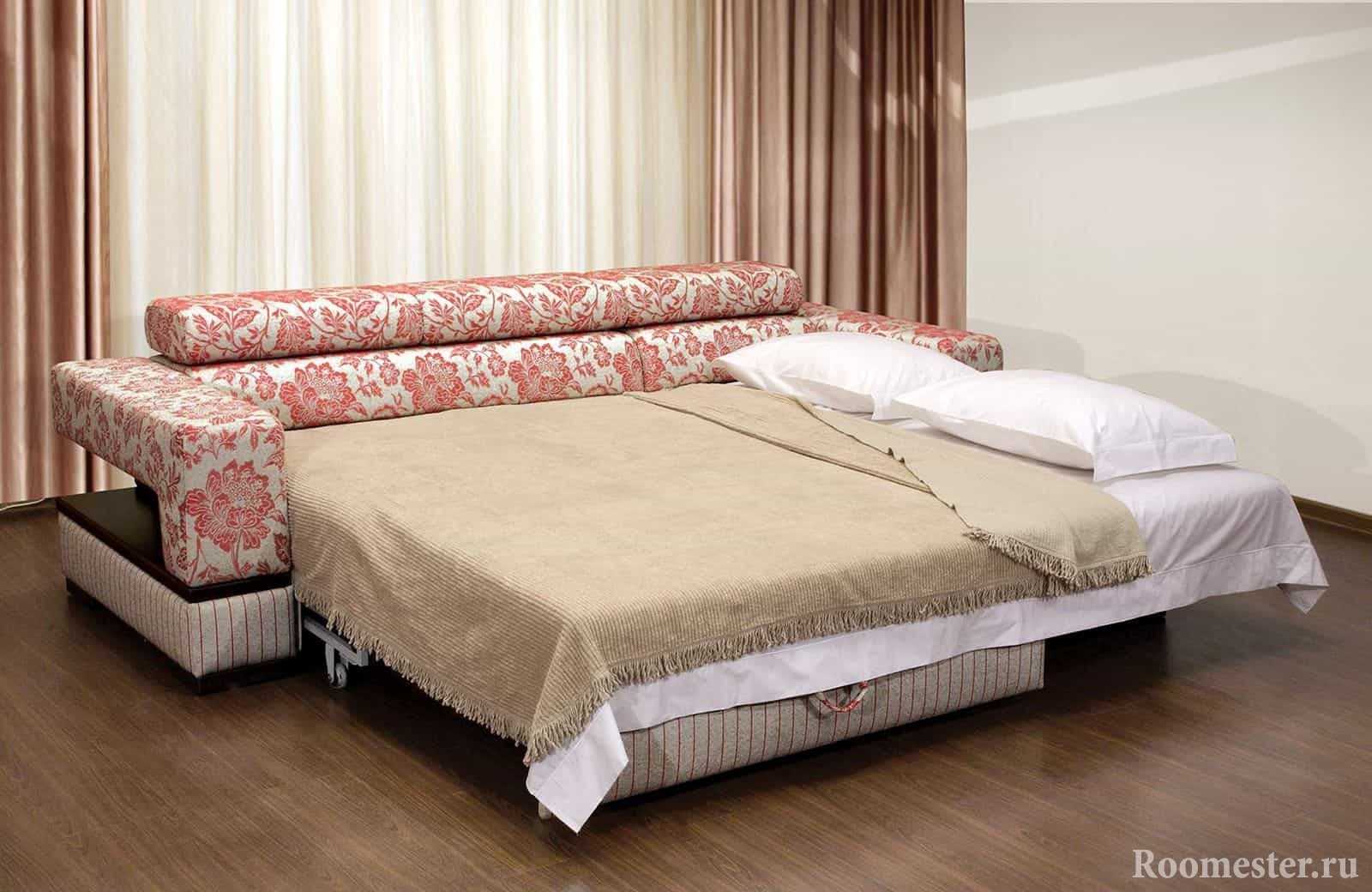 Лучше отказаться от дивана с раскладушкой в пользу надежной выкатной модели на деревянном коробе с роликами или на электроприводе (трансформация от пульта ДУ)