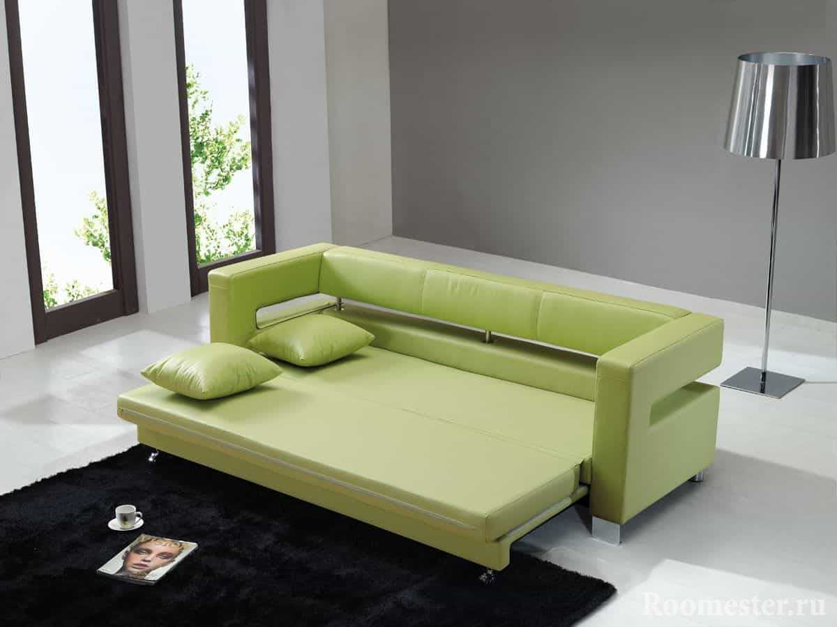 Такое решение выбирают владельцы малогабаритных квартир, например, хрущевок. Преимущество дивана-кровати в том, что он легко складывается и превращается в полноценное место для приёма гостей: остаётся лишь выбрать удобный кофейный столик, который без труда можно перемещать по комнате.