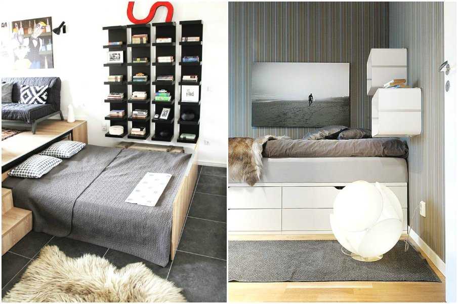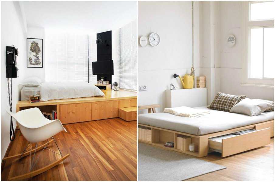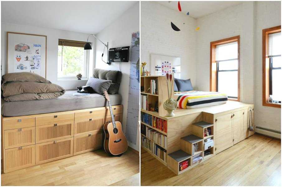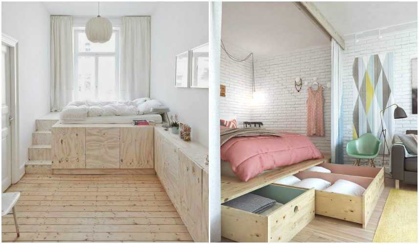 Подиум в виде невысокой платформы с откидным механизмом или выдвижными ящиками — функциональное решение для маленькой спальни.