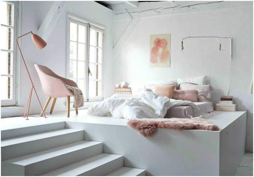 - удобное зонирование комнаты – подиум зрительно отделяет зону сна, это станет оптимальным вариантом для студий, квартир «однушек»;