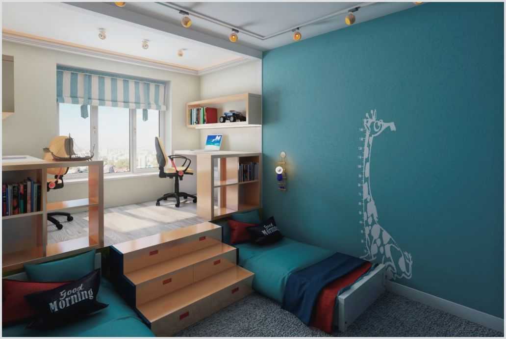 Для компактного обустройства детской для двоих воспользуйтесь уже проверенной схемой. Две кровати выполняются на выкатных механизмах и располагаются по двум сторонам комнаты. В дневное время их можно задвигать в каркас и освобождать тем самым пространство. Между кроватями размещают ступени, ведущие на подиум. На самом подиуме обустраивают рабочую зону. Чтобы не терять полезное пространство ступени также могут быть дополнительными нишами для хранения вещей.