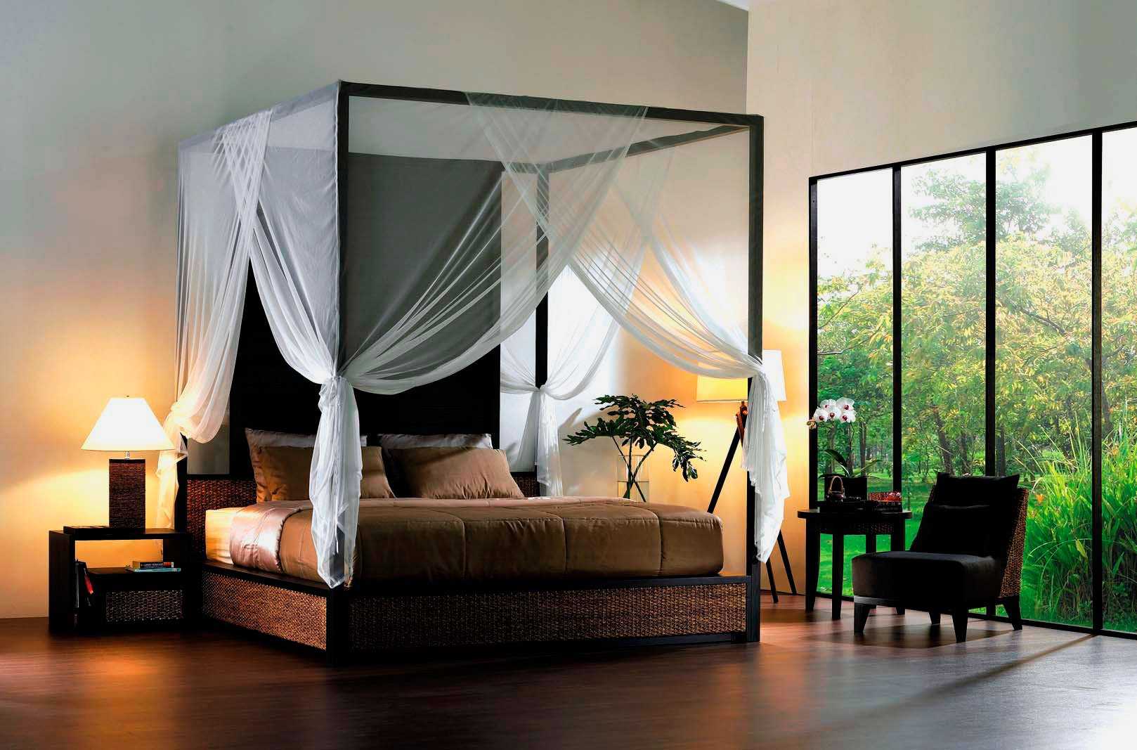 - Балдахин – занавес, который накрывает постель сверху, создает уют и ощущение уединенности и покоя. Иногда несет и практическую пользу: защищает от мух и комаров или укрывает от ярких лучей солнца. Есть у этого дополнения и минус: балдахин собирает пыль, и его придется часто снимать и стирать.