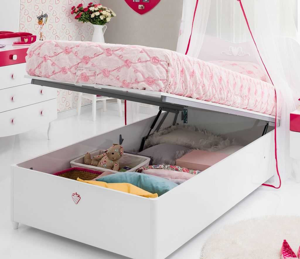 - Односпальной кроватью с подъемными механизмами. В таком случае поднятое основание с матрасом открывает вместительное отделение для хранения.
