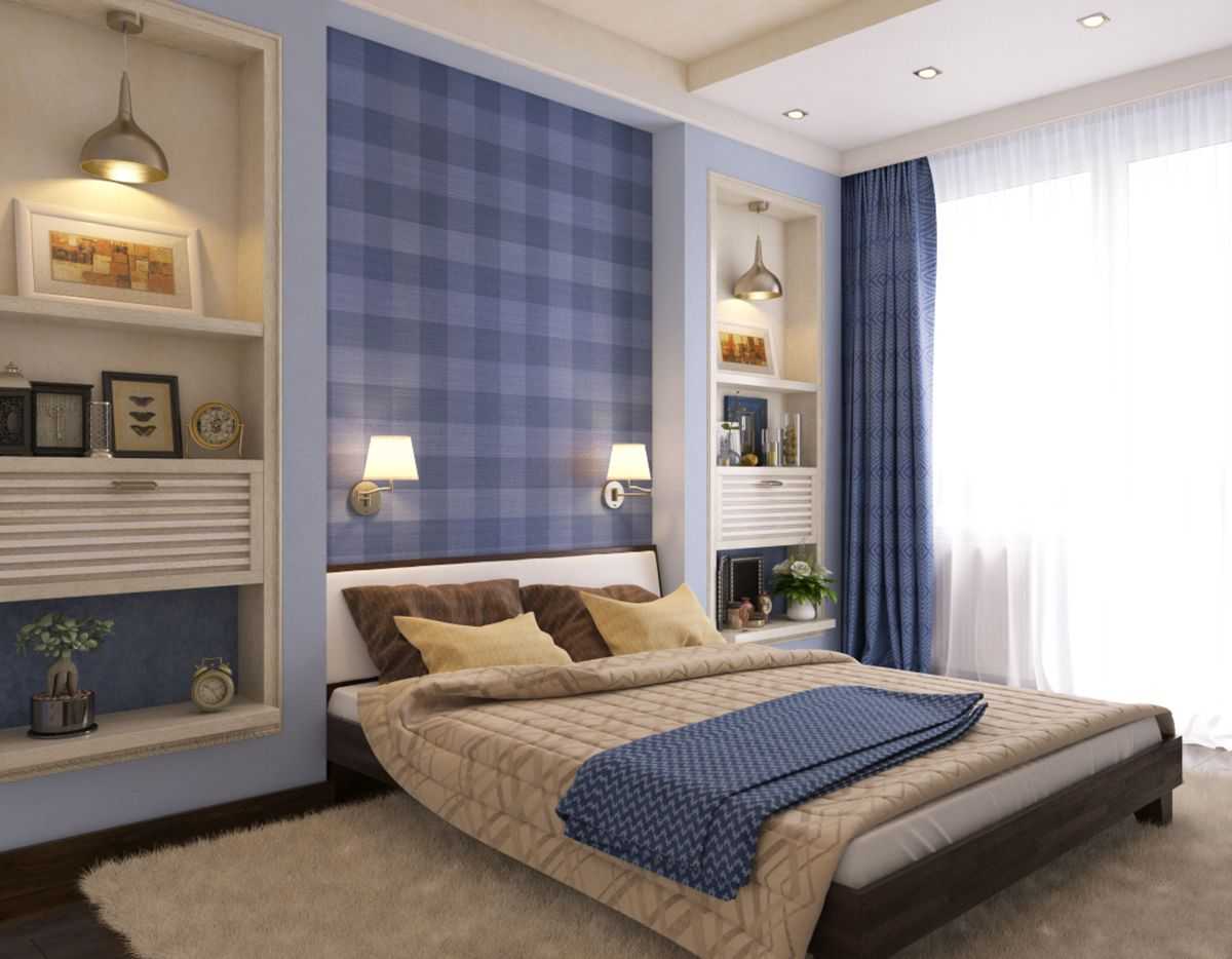 Для небольшой спальни вполне актуален вариант с оформлением ниши в изголовье кровати, которую можно утопить в стену до 40 см и украсить её точечными светильниками.