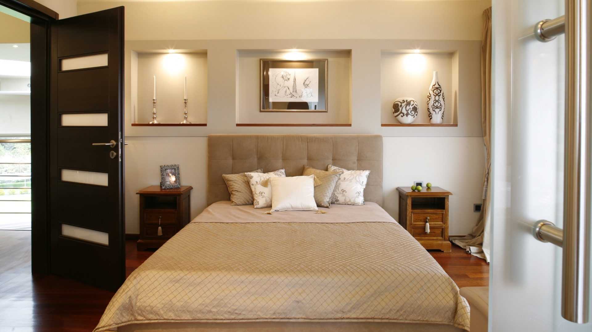 Для больших предметов, например, кровати, шкафа идеальны ниши на уровне пола, то есть функциональные. Такое углубление интерьера можно расположить в спальне. Дизайнеры пришли в мнению, что такие углубления в стене обязательно должны быть дополнены другими элементами, например, меньшими нишами рядом или многоуровневым потолком.