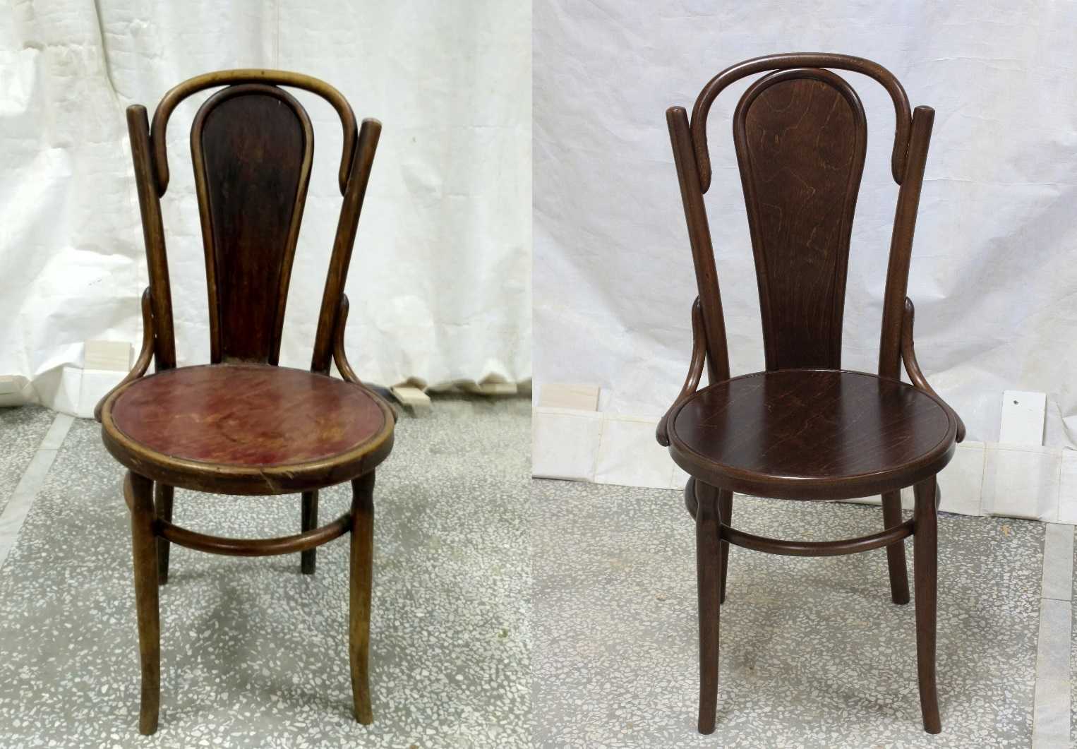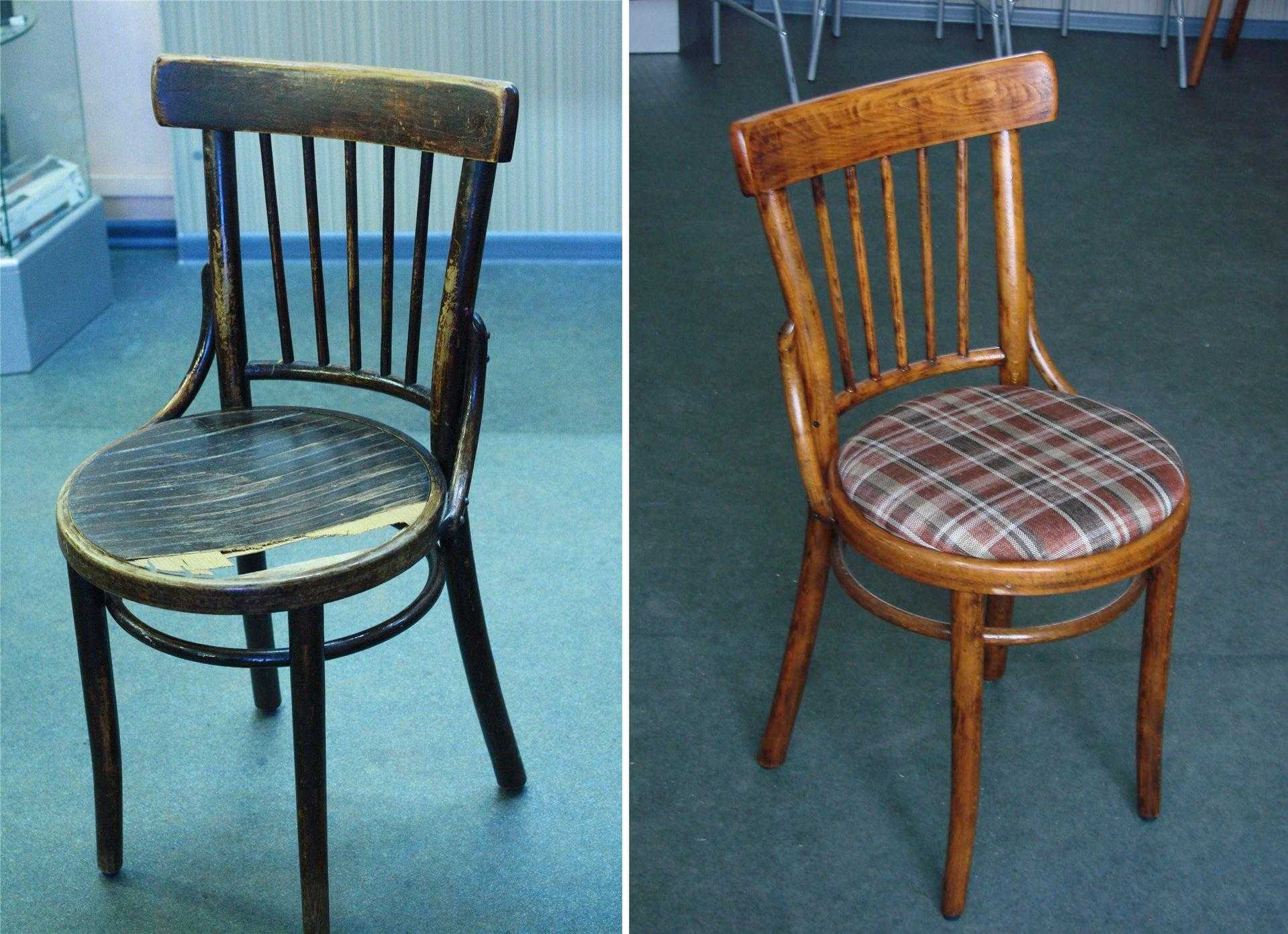 Например, если брать во внимание восстановление стульев, то на сиденье достаточно натянуть новую ткань. На фото можно увидеть изделие до и после реставрации