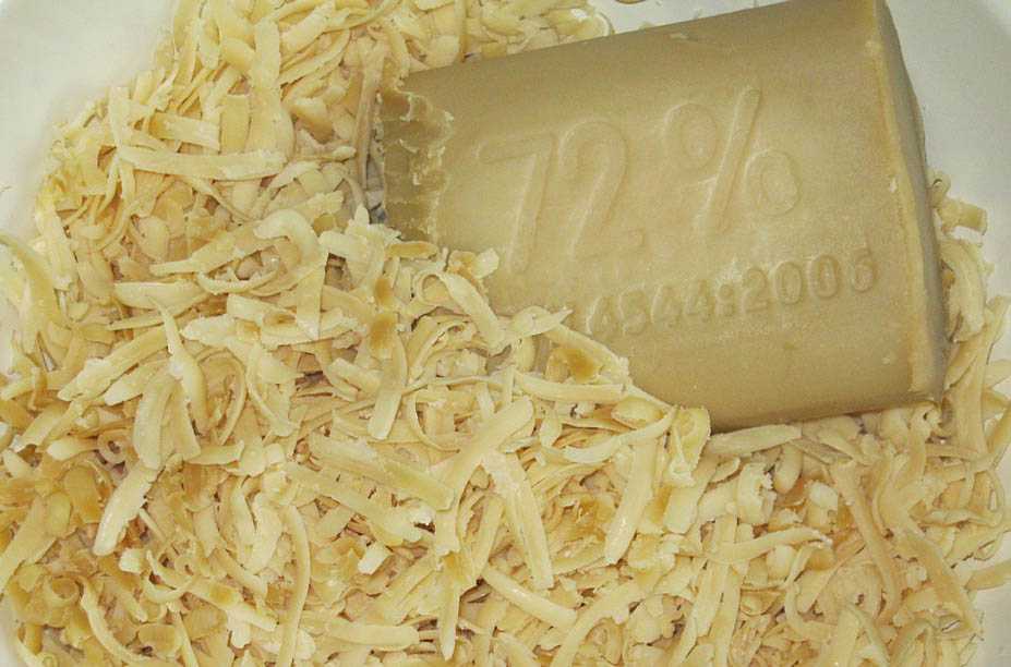 - Нужно взять кусочек средства и растворить его в теплой воде. Чтобы быстрее приготовить мыльный раствор, часть бруска можно натереть на мелкую терку.