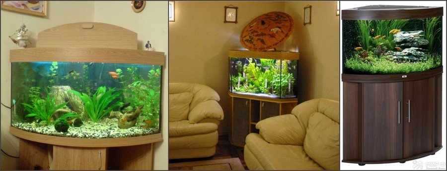 - Габариты, форма и геометрические параметры аквариума. Угловые резервуары хорошо подходят тем, для кого на первом плане стоит экономия свободного пространства в помещении. Их необычная форма позволяет экспериментировать с дизайном интерьера, и зрительно увеличивает емкость аквариума. Настенные изделия встречаются в продаже редко, и связано это с тем, что профессионалы долгое время опасались таких аквариумов из-за того, что они подходят не для всех видов рыбок. Связано это с тем, что такой резервуар по своему строению может быть только узким по глубине, из-за чего уход за ним усложняется, по сравнению со стандартным. В современных изделиях такого типа многие подобные недостатки устранены, благодаря чему он подходит не только для профессионалов, но и для новичков. Панорамные аквариумы отличаются от остальных наличием большого изогнутого стекла, позволяющего разглядеть малейшие детали не только в его интерьере, но и на каждой рыбке. Достигается этот эффект благодаря применению стекла специальной формы с увеличительным эффектом. Резервуары такого типа могут быть угловыми, круглыми, овальными, квадратными и прямоугольными. Прямоугольные (классические) аквариумы – самый продаваемый вид, идеально подходящий не только для содержания рептилий, животных и насекомых, но и большинства видов рыб (при этом желательно, чтобы высота резервуара была примерно равна его ширине – в таком случае воздух равномерно распределяется по всему объему резервуара, и пространство для рыб максимально эффективно используется). Это самый хороший аквариум для начинающих. Помимо его универсальности, можно отметить и тот факт, что такие изделия обычно самые недорогие. Эти резервуары универсальны, и хорошо подойдут для большинства рыб – большая площадь дна и высота позволяют комфортно разместиться не только донным обитателям, но и тем, кто имеет высокий «рост» — например, скаляриям.