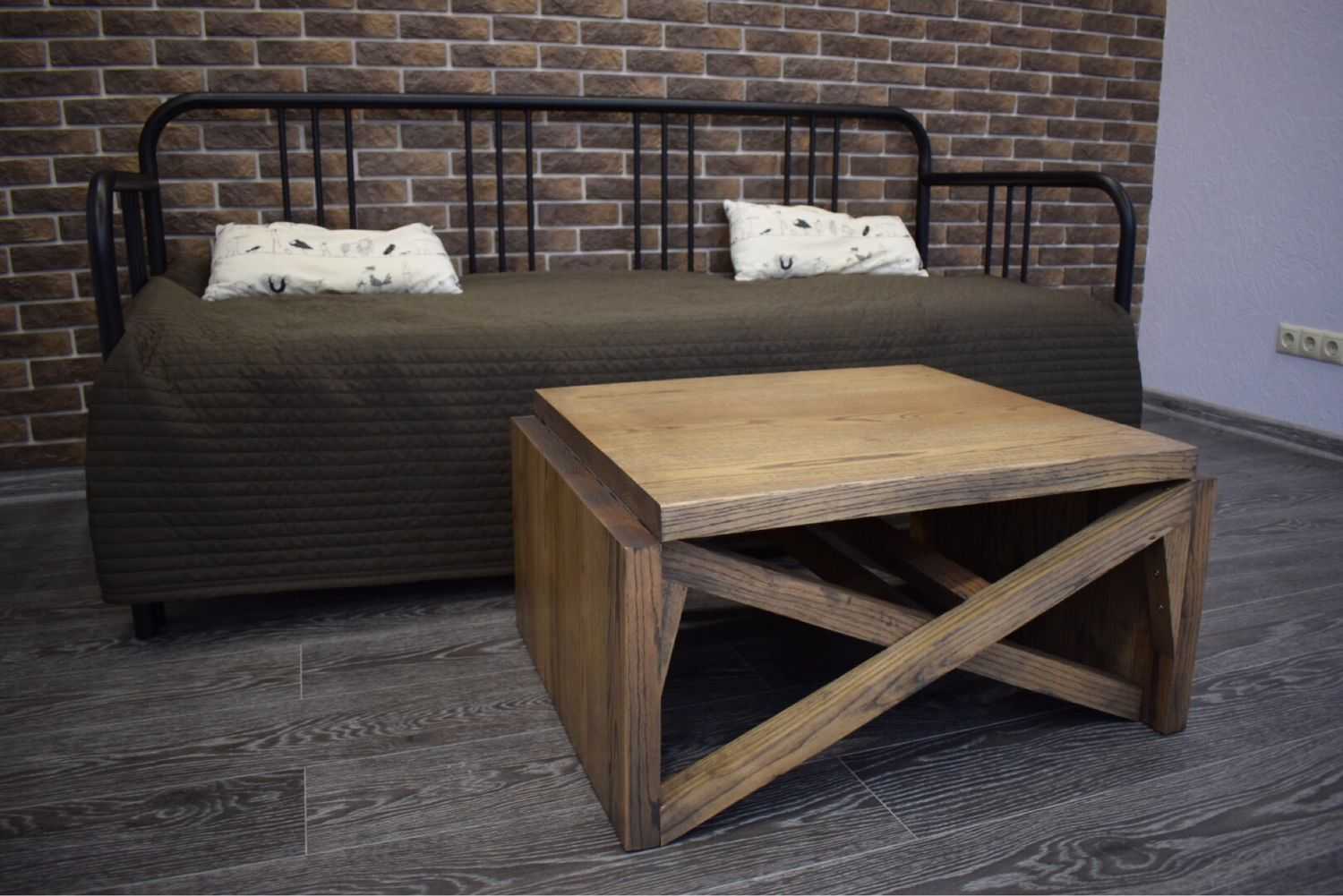 На фото журнальный стол из натурального дерева. Низкий трансформер в зале становится удобным для работы или чаепития, благодаря выдвижной верхней панели.