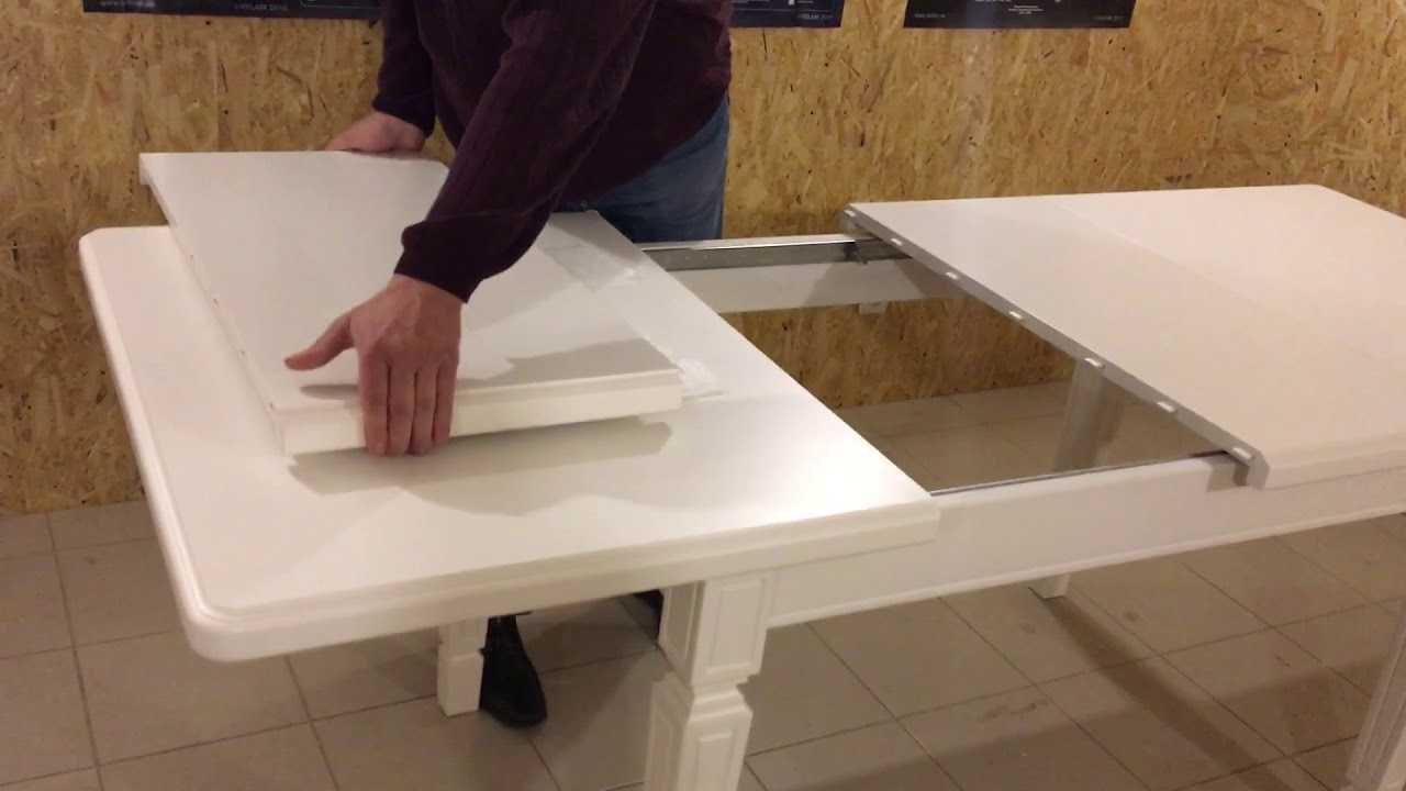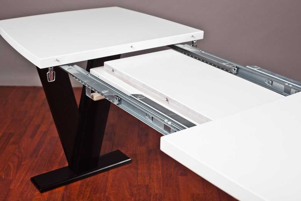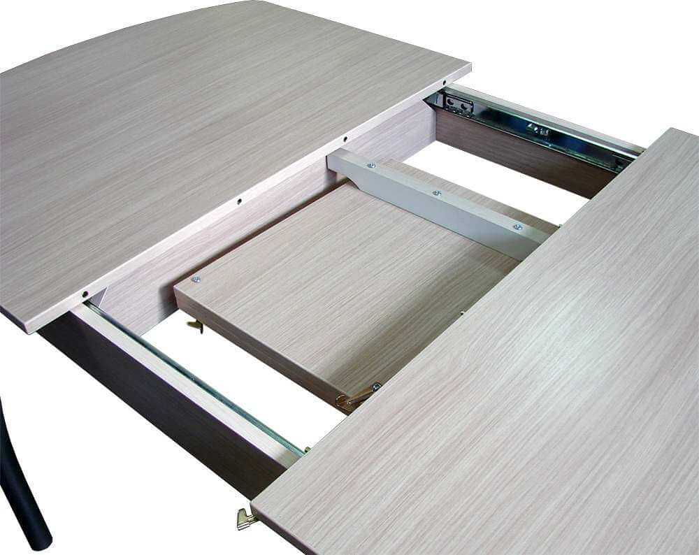 Добавочная часть столешницы может размещаться в центре или по бокам стола.Использование автоматического механизма. Имеет одну или две добавочные поверхности, расположенные под столешницей. Когда основная часть начинает двигаться, двигаются и дополнительные части.