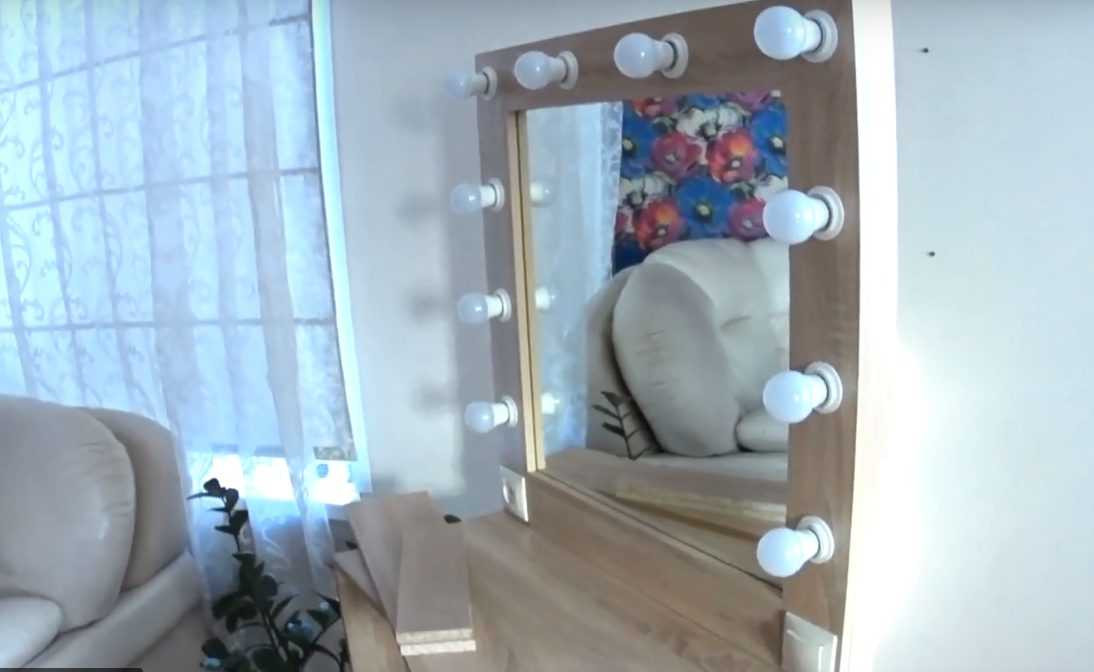 После этого гримерное зеркало устанавливается на свое место: крепится к столешнице или вешается отдельно. Если рамка квадратной формы, количество светильников – 10: по 4 с боковых сторон и два наверху. У круглого стекла подсветка зависит от диаметра.