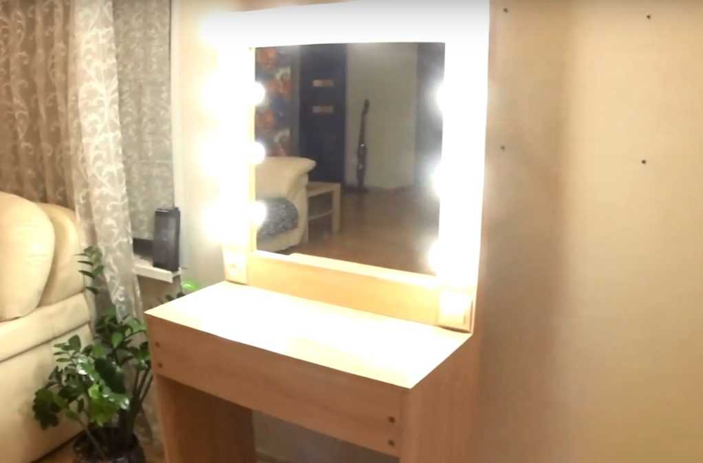 Оригинальное изделие из подручных материалов станет достойным украшением любого интерьера. Самодельный столик для макияжа прослужит намного дольше покупного. Главное – не перегружать его косметикой и другими вещами, чтобы со временем столешница не прогнулась. Интересная мебель, выполненная в винтажном стиле, создаст дома неповторимую атмосферу. Поставить столик с зеркалом и подсветкой можно в прихожей или в спальне, в зависимости от наличия свободного места.