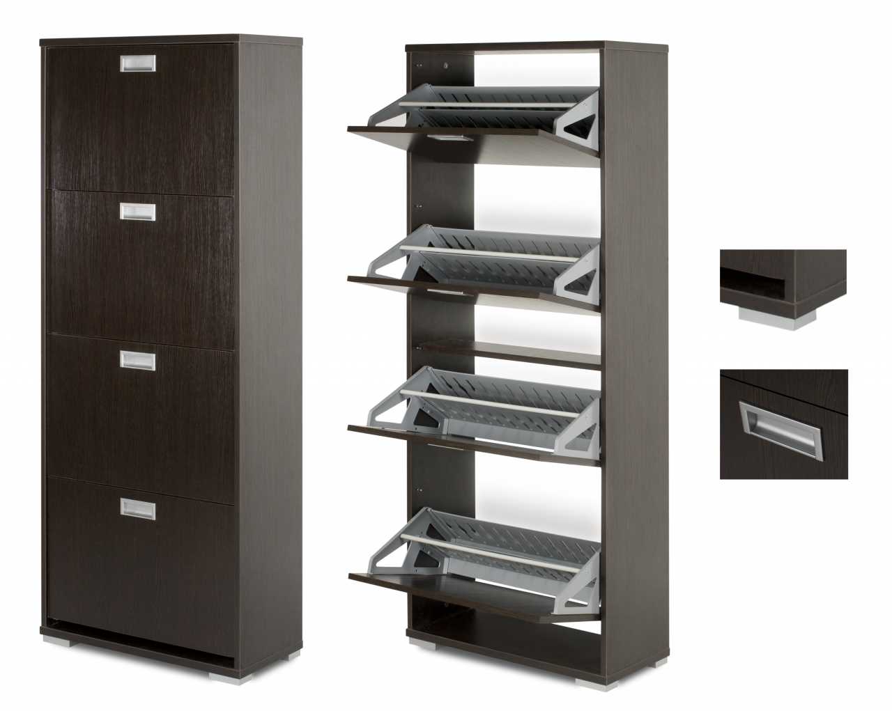 Обувницы подобной формы в последнее время становятся более востребованными. Это узкие вытянутые вверх шкафчики, они не займут много места и отлично впишутся в маленький коридор. Ширина полок при этом не превышает 20 см. Обувница представляет собой узкий ящик с откидными полками, на которых и хранится обувь. Чем меньше угол открывания полки, тем больше остаётся пространства для хранения высокой обуви. Это существенный недостаток таких обувниц — форма обуви, например, сапог с высокими голенищами, теряется.