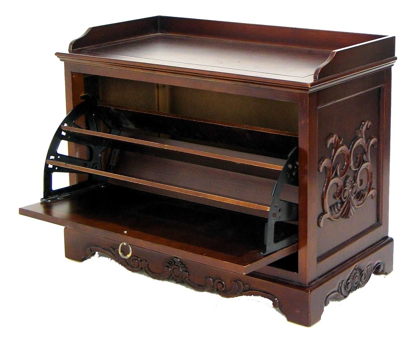 Такая обувница по конструкции схожа с небольшим шкафчиком или тумбочкой с распашными или откидными дверцами. Такие обувницы часто дополнены сидением, которое легко заменяет пуф или скамеечку. Ящик в прихожую с мягким сиденьем экономит место, сочетая два типа мебели, что удобно, если площадь помещения слишком мала. Закрытая тумба надёжно хранит обувь от пыли и грязи, но не даёт ей полностью просохнуть и избавиться от неприятного запаха. Более дорогие снабжены вентиляционными системами, что избавляет от проблемы.