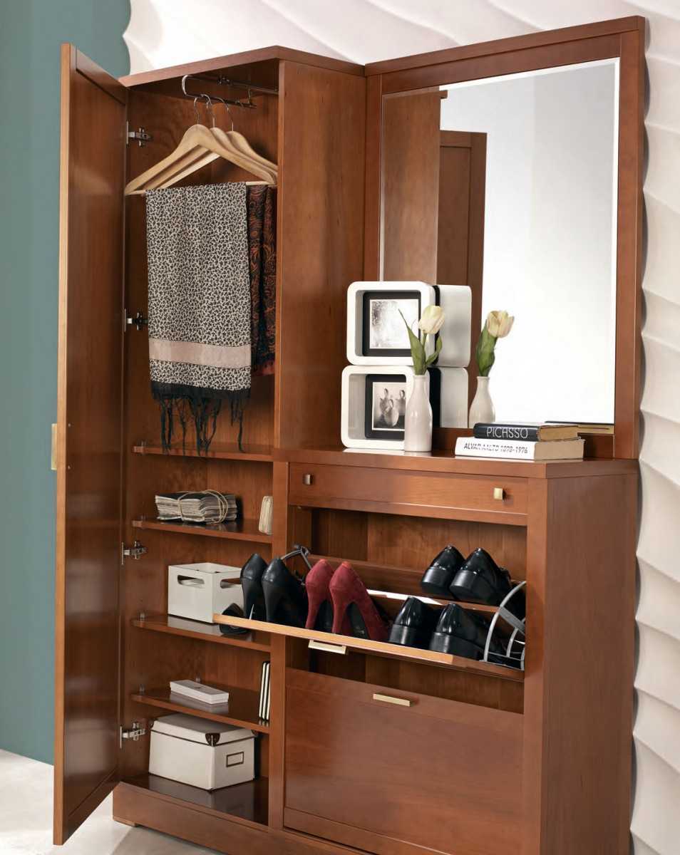 Многофункциональная модель, часто совмещённая с тумбой для головных уборов, вешалками для одежды, подставкой для зонтов или с зеркалом. Примеров комбинации перечисленных модулей масса, так что приобрести тот тип, который лучше впишется в вашу прихожую, не составит труда. Узкие зеркальные обувницы в прихожую также разнообразят интерьер и за счёт отражающей поверхности зрительно расширят пространство.