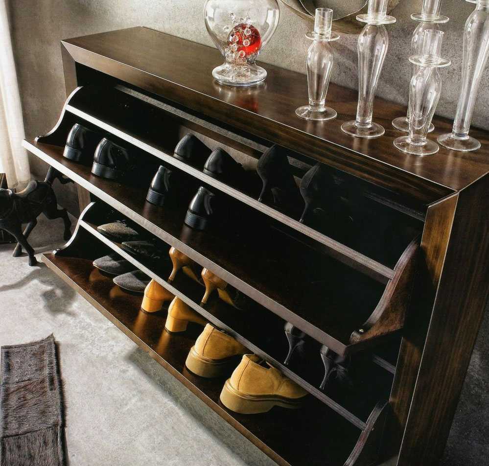 - обувная полка в прихожую из массива дерева подойдёт для классических интерьеров;