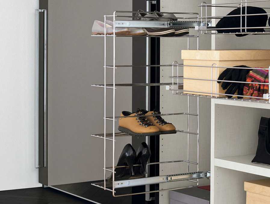 Для счастливых обладателей просторных квартир, где есть отдельная гардеробная, обустроить систему хранения обуви не составит труда. Для этой цели используют открытые стеллажи или выдвижные полочки. Отдельного внимания заслуживают сетчатые полки, позволяющие туфлям проветриваться.