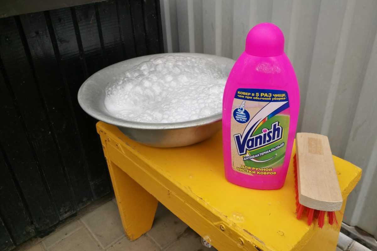 Для влажной очистки применять нужно шампунь Ваниш. В тазик с водой добавляется чистящее средство, жидкость взбивается до образования пены. При помощи мягкой губки пена аккуратно наносится на периметр загрязненной поверхности. Как только она высохнет, ковер нужно пропылесосить.