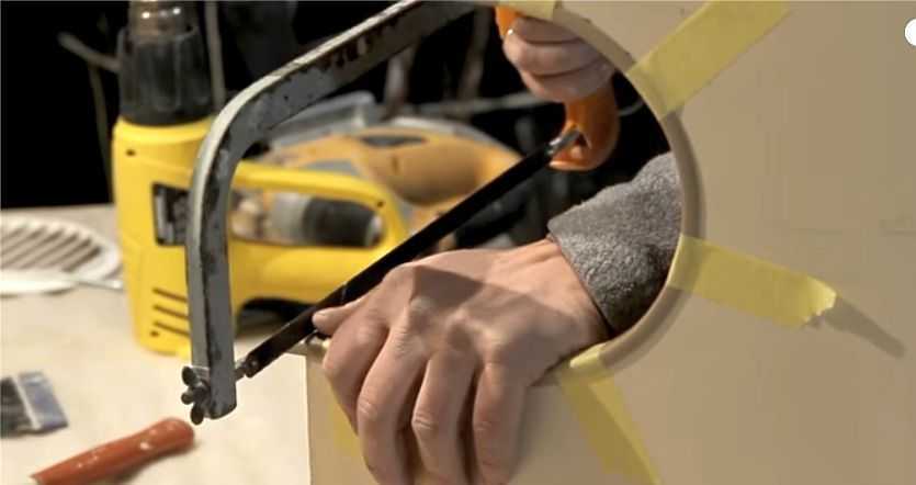 Дрелью со сверлом 5 мм сверлятся отверстия под саморезы и под резку отверстия лобзиком. Оно вырезается точно по линии, отмеченной циркулем из намеченного по шаблону центра. Выпиливание отверстия под воздуховод