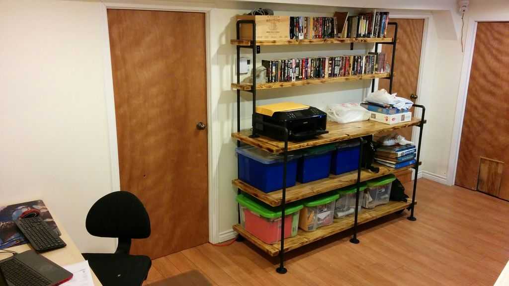 Первым делом рекомендуется сделать чертеж, схему будущего изделия. Далее по ним подготовить необходимое количество определенного размера деталей. Все соединить между собой. В качестве основания полок может выступать фанера или другой материал. Единственное, о чем нельзя забывать, материалы не являются пригодными для больших нагрузок.