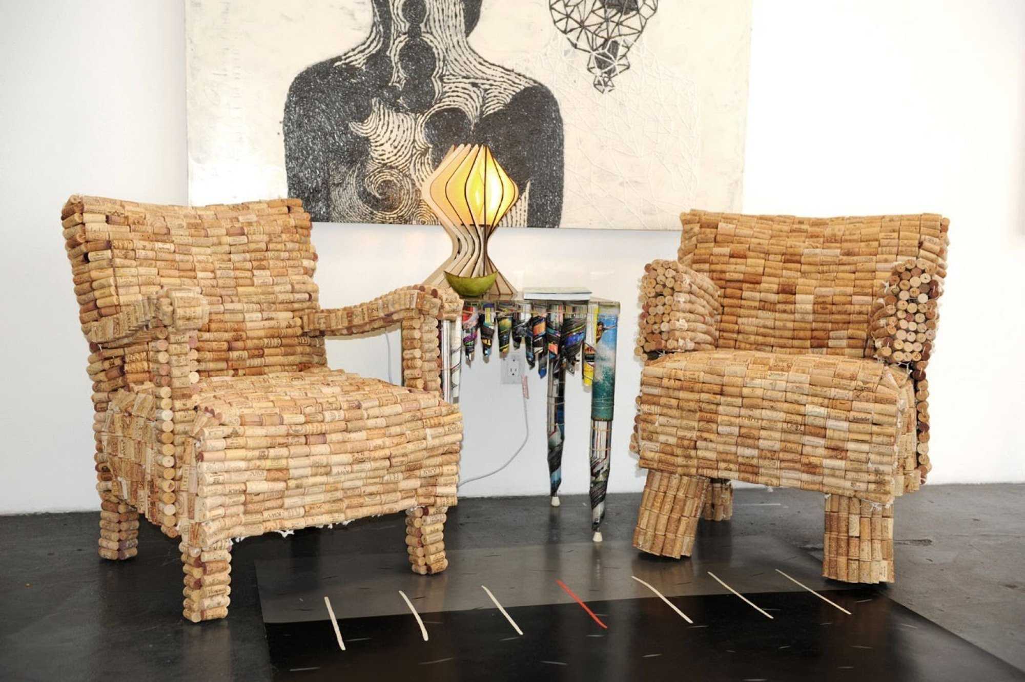 Дизайнеры-конструкторы мебели иногда применяют очень неожиданные материалы. Например, бескаркасная мебель из винных пробок уместно смотрится в обстановке загородных домов, отсылая к пляжной атмосфере. Отдельное направление — поиск материалов, которые нанесут минимальный урон окружающей среде. Так появилась дизайнерская мебель из волокон вулканической породы (базальтовых волокон), которые соединяются эко-смолами. Она отличается прочностью и легкостью, а полиуретановое покрытие защищает от воздействия солнца.