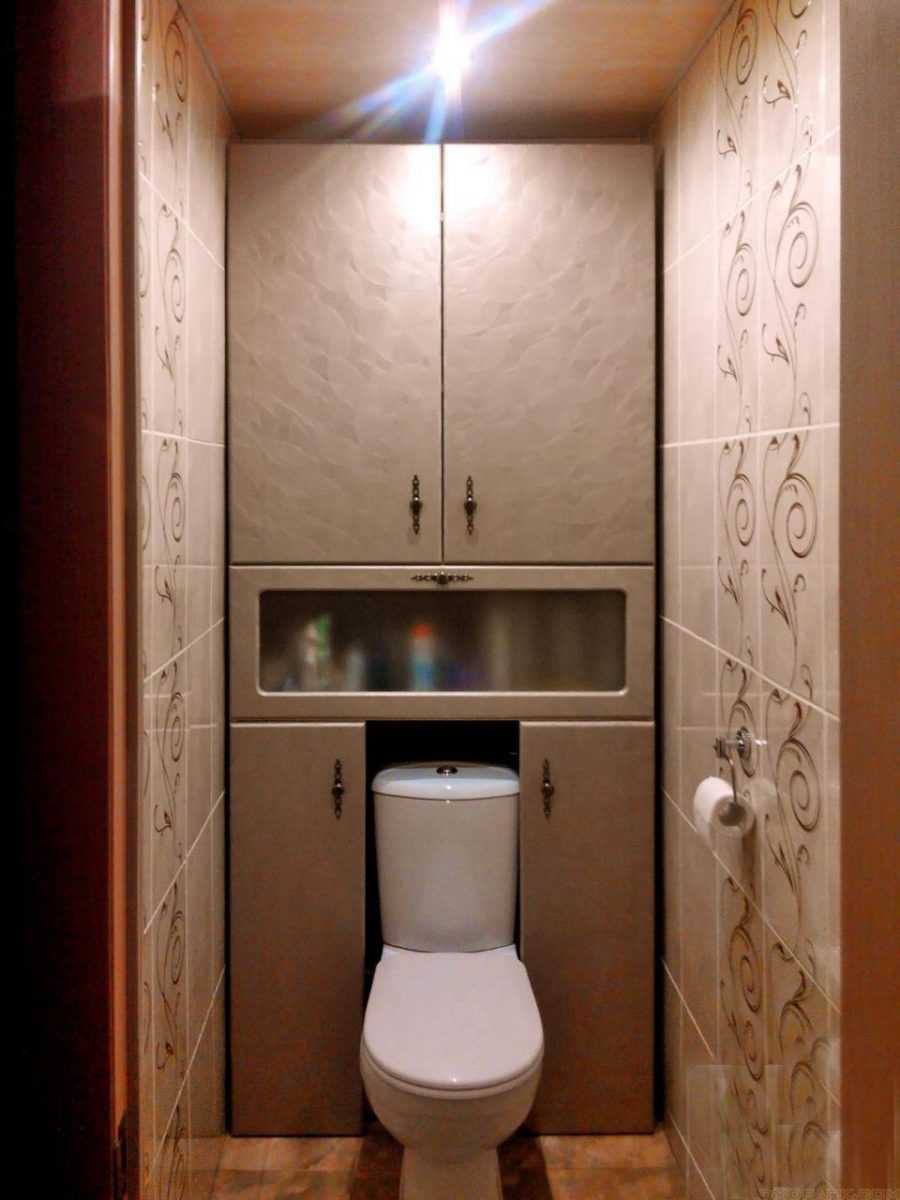 Для устройства придется вынести унитаз вперед, к стенам и на потолке прибить планки (40*40 мм вполне нормально будет), набить горизонтальные планки, которые будут удерживать полки. Дверки для такого шкафа в туалет крепятся непосредственно к стенам. Вернее, к планкам, которые закреплены на стене.