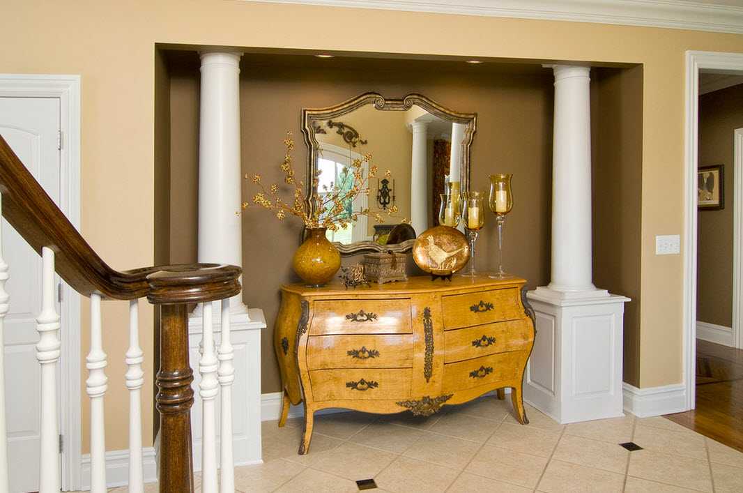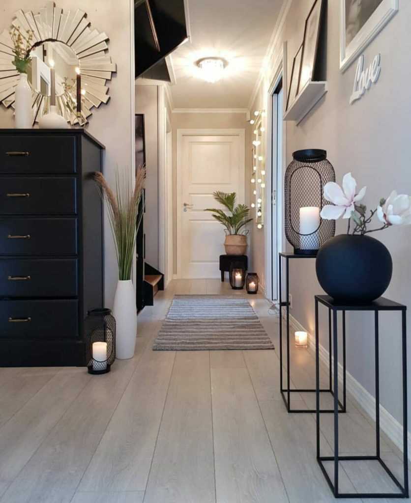 Великолепно будет смотреться мебель дополненная вазами или горшочками с цветами. В качестве изысканного декора можно использовать подсвечники. На конструкцию уместно поставить несколько красивых картин и фоторамок, симпатичную лампу или даже стильное радио, для создания определенного настроения в коридоре.