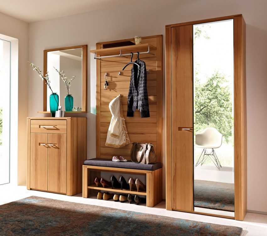 Уходя всегда удобно бегло осмотреть себя, поэтому зеркало. Обувь удобнее одевать сидя, а под сидушкой иметь открытое место для её хранения