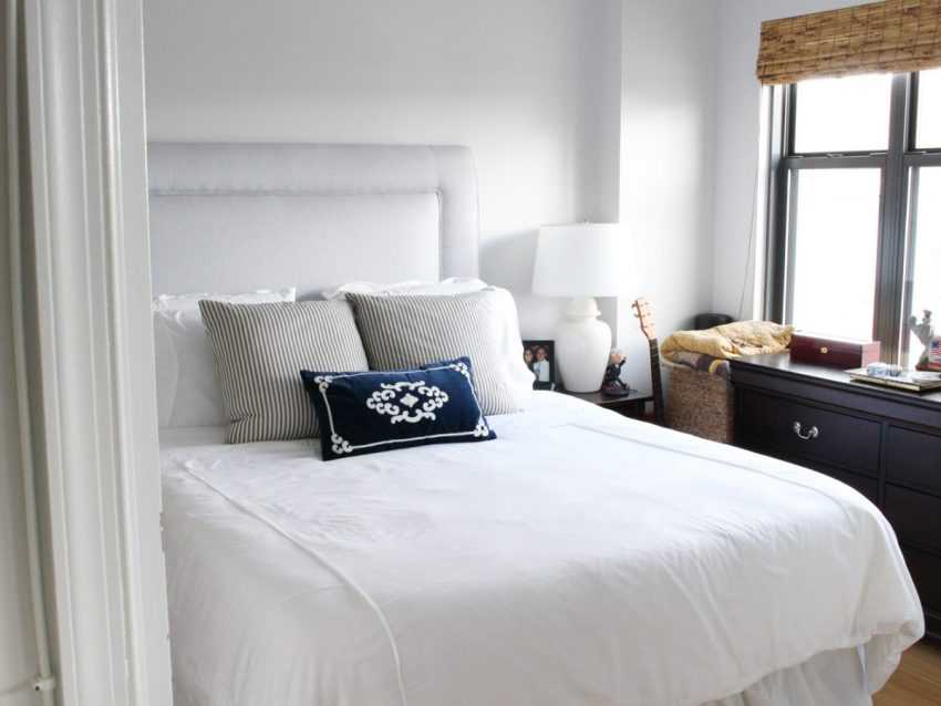 Всем известно правило, светлые цвета делают маленькую спальню просторнее. Однако это не означает, что стены в комнате должны быть исключительно белыми. Нежные оттенки станут лучшим решением для создания комфортного дизайна. Такие цвета как бежевый, небесно-голубой, светло-серый, кремовый или песочный освежат интерьер или сделают его теплее, без ущерба для драгоценных квадратных метров.