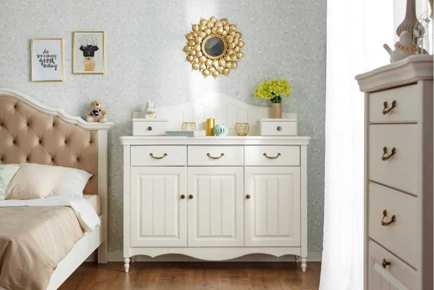 Расположить его можно рядом с изголовьем кровати или на противоположной стороне, используя как подставку для телевизора. Иногда комод устанавливают в изножье кровати, в этом случае лучшим вариантом станет приобретение невысокого предмета меблировки, а его верхняя часть используется как место для хранения покрывала и декоративных подушек в ночное время.
