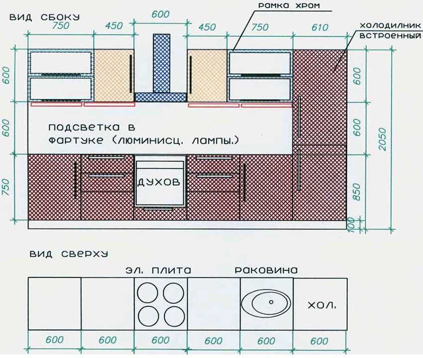 Начнем со стандартных размеров элементов (и соответственно – фасадов) для линейной кухни.