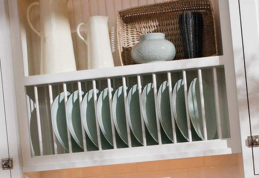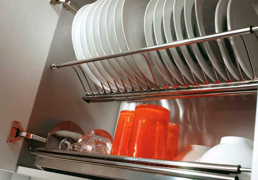 Сушилка для посуды. Это специальная металлическая решетка, которую размещают в навесном кухонном шкафу для посуды. В зависимости от вместительности модели можно установить одно- или двухуровневую сушилку.