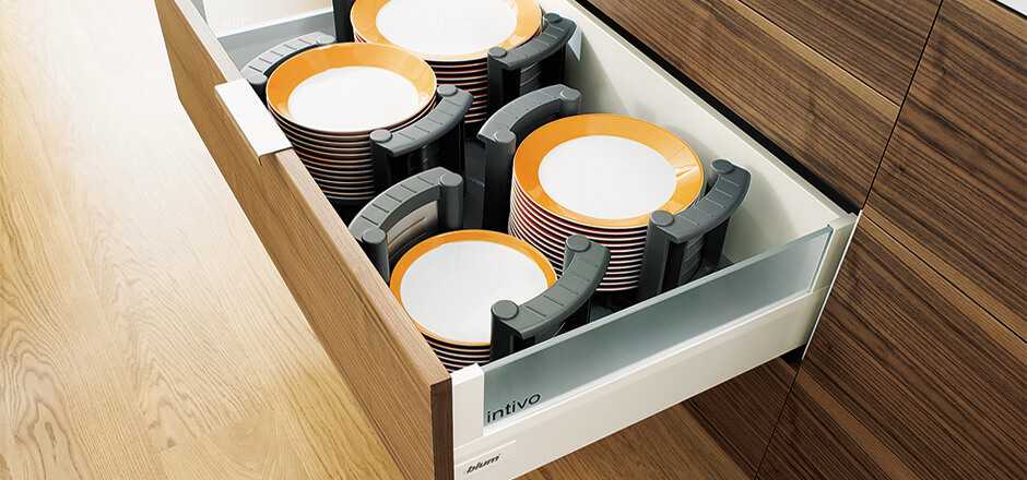 Напольные тумбы помимо стандартных полок могут оснащаться выдвижными ящиками, внутреннее пространство которых поделено на отдельные отсеки посредством специальных разделителей. Разграничители уберегают посуду от ударов друг о дружку при выдвижении ящиков.