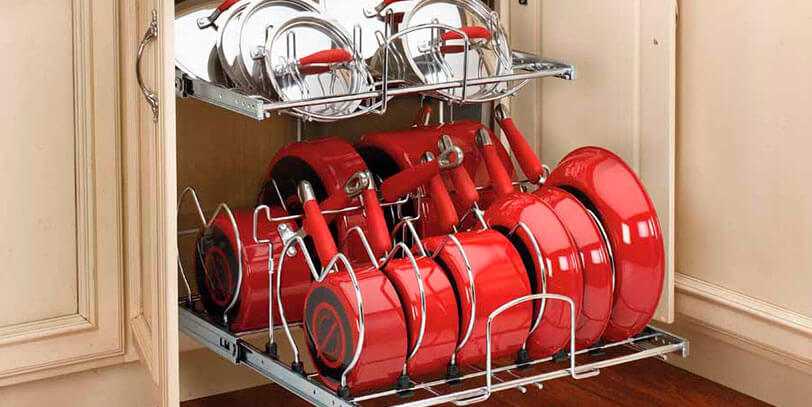 Для расположения сковородок внутри кухонного модуля применяют следующие виды систем хранения: