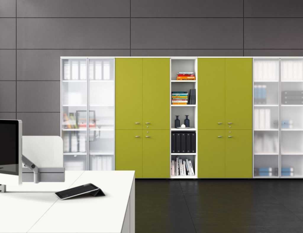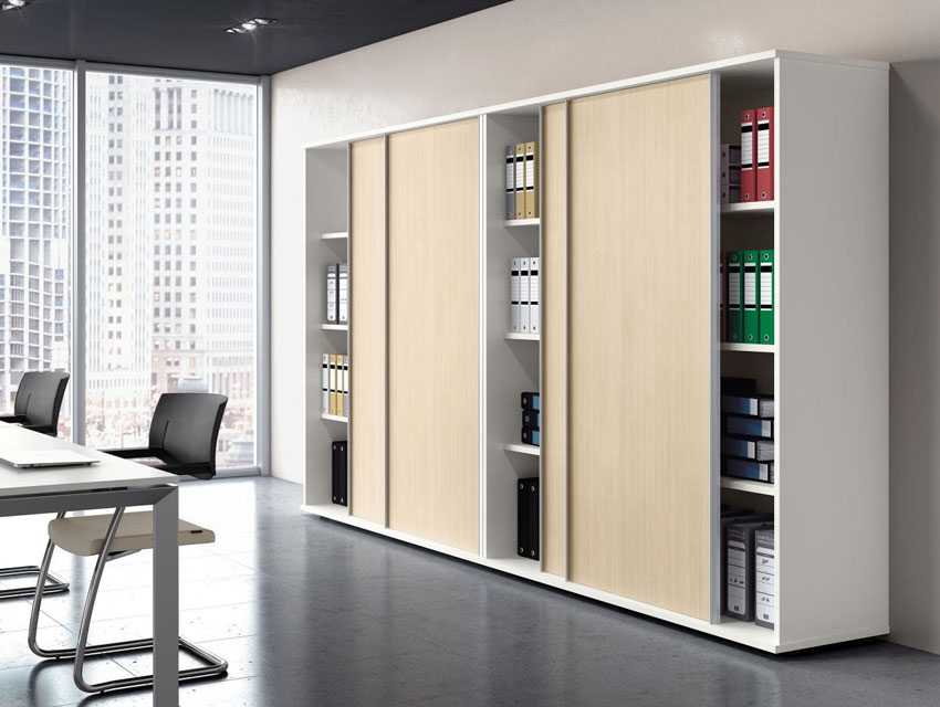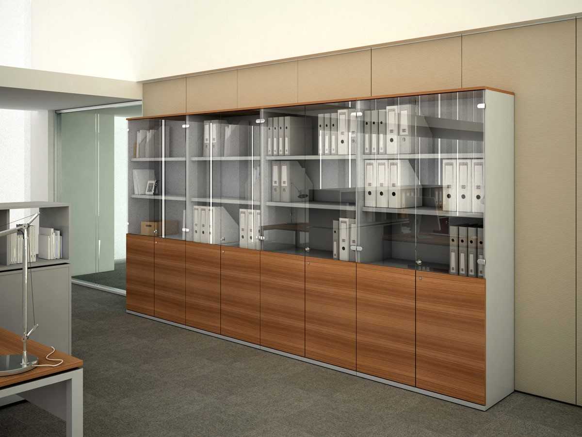 Такой офисный шкаф считается стандартным. Внутреннее наполнение, внешнее оформление, используемые материалы, наличие или отсутствие створок различаются в зависимости от модели и предъявляемых к ней требований. Помимо документов, в шкафах для офиса можно хранить личные вещи сотрудников, расходные материалы и канцелярские принадлежности. Мебель может быть оборудована под буфет и располагаться в чайной зоне. Если позволяет место, шкафы для документов со стеклянными дверьми используются одновременно как украшение интерьера, хотя в большинстве своем такие изделия выпускаются в минималистичном дизайне, сдержанных цветах, характеризуются отсутствием сложного декора. Так как мебель применяется в условиях интенсивной эксплуатации, конструкция обычно прочная, износостойкая, технически безопасная. Ее основные функции — сохранность документов, их защита от влаги, пыли, огня, других внешних негативных факторов.
