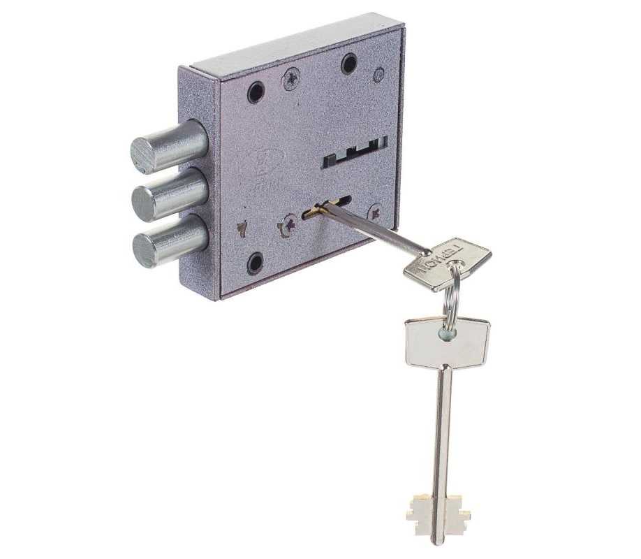 - Среднюю (до 10 минут) — врезные замки, накладные и навесные. Внешне могут быть похожи на следующий тип, но изготавливаются из стали меньшей прочности. Обычно используются в подсобках и раздевалках.