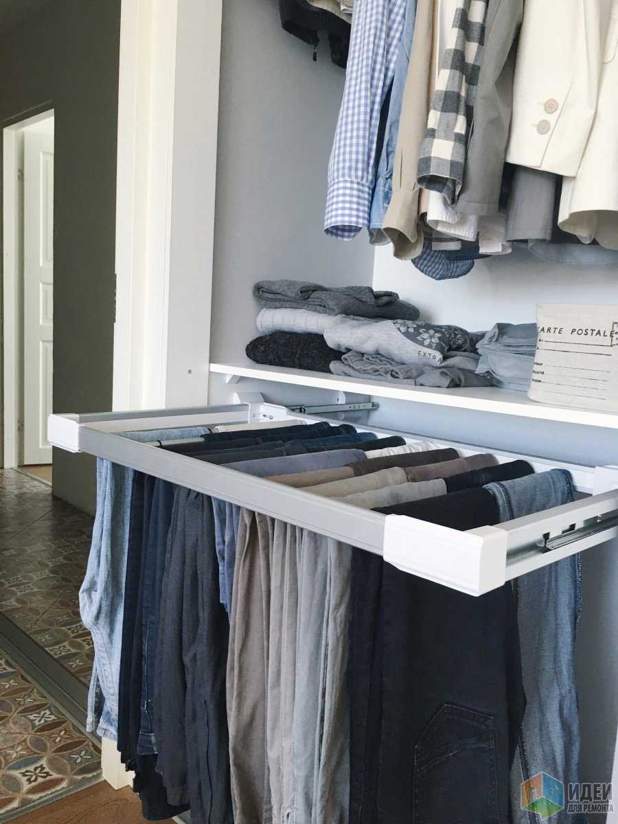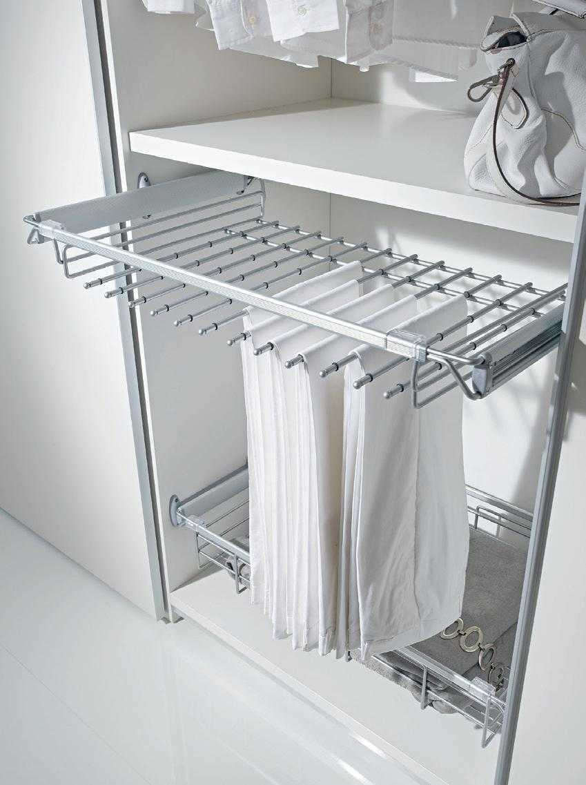 - Держатели для брюк со стационарным или выдвижным механизмом упорядочивают вещи, позволяя сохранять строгие стрелки на классических моделях и не давать тканям мяться.