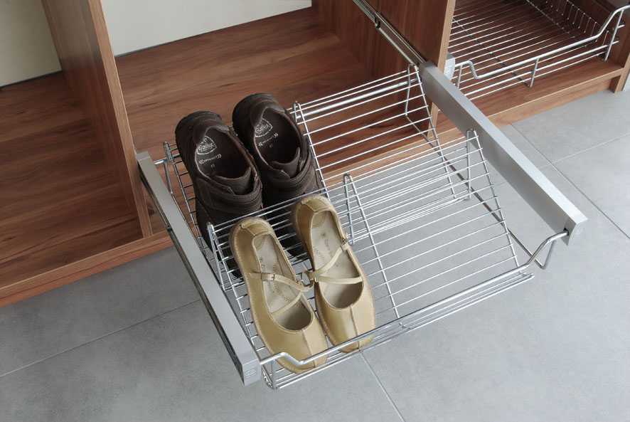 - Выдвижные или стационарные сетчатые корзинки. Они удачно помогают организовать хранение обуви или других аксессуаров. К ним же относятся каскадные наклоненные полки для обуви с противоскользящим или сетчатым покрытием.