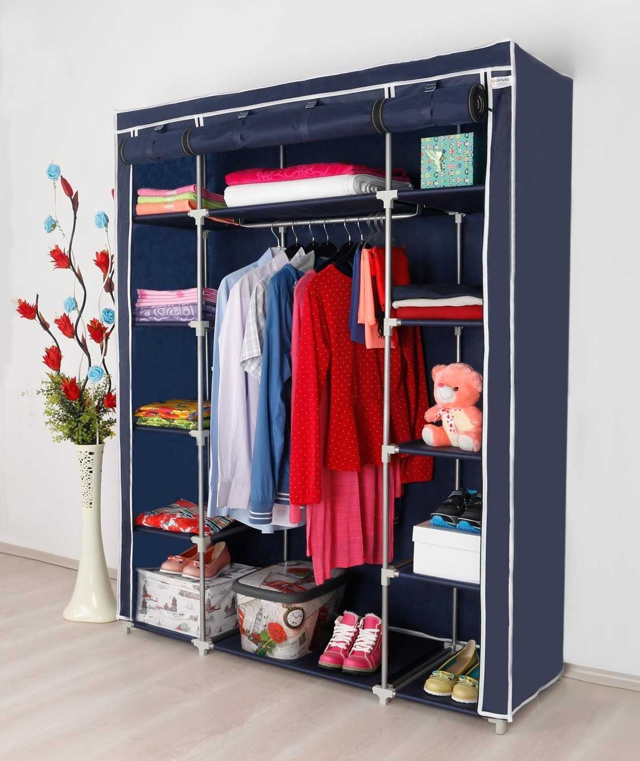 - Тканевый гардероб прост в уходе. Полотно снимают с каркаса и стирают в машинке, установив режим «синтетика». Исключением является тканый полипропилен, который нельзя подвергать такой чистке. Этот материал стирают с помощью мыльного раствора и ветоши.